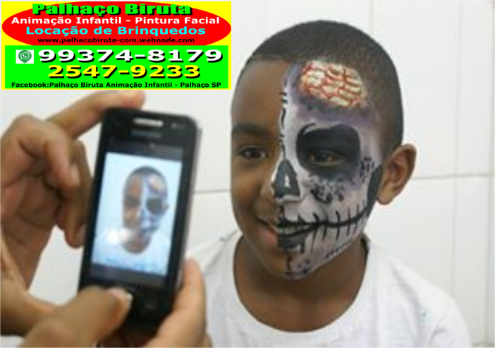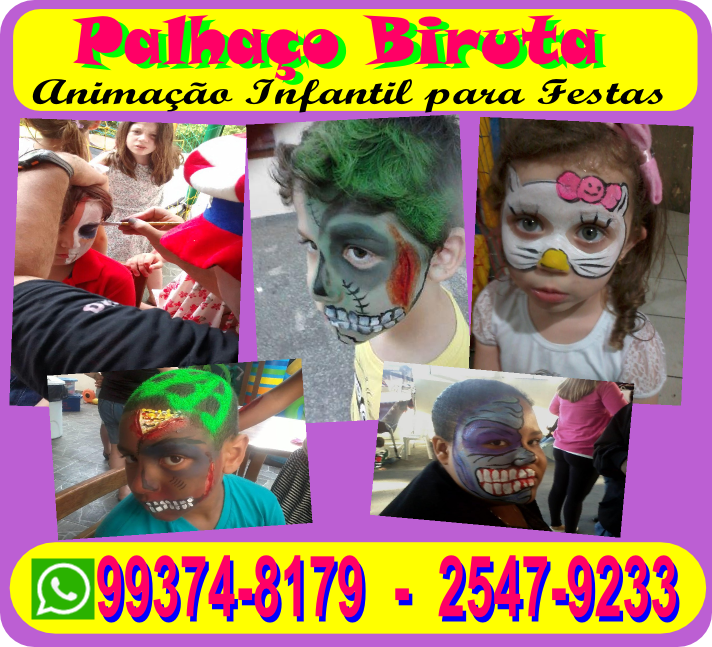 Pintura Facial do Palhaço Biruta: Desenhos exclusivos do nosso catálogo e também criações na hora de acordo com os pedidos das crianças. Material anti-alérgico e próprio para a pele infantil. Também trabalhamos com pancake para as pinturas realistas e massa mágica para as pinturas 3D e de terror.
